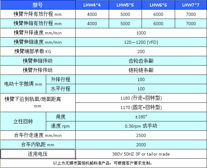根據橫臂末端承載能力,我司焊接操作機可以分為LHQ輕型、LHZ中型、LHW重型和HCJ超重型。每一個類型的操作機都可以按照客戶的要求進行設計制造。以下為我司標準LHW重型焊接操作機的主要參數。